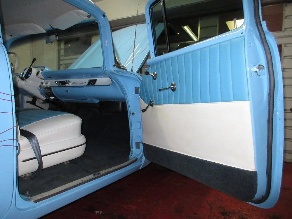 The 1957 Chevrolet 210 wagon is an iconic Tri-Five family vehicle blending classic, bold styling with practical, spacious transportation. Positioned as the mid-range model, it offered an affordable alternative to the Bel Air while featuring powerful V8 engine options. Today, it is a highly popular, nostalgia-driven collector car celebrated for its blend of 1950s style and dependable daily driving capability. This particular example was restored as Street Rod about 15 years ago at which time it was fit with a freshly rebuilt 350ci V8, a T350 tranny and a 9-inch posi rear end with a gear in the low 3’s for highway cruising. The engine is fed via a Holley 650cfm 4bbl carb with electric choke and an Edelbrock intake. It is sparked with a Mallory electronic ignition and it sounds awesome ripping through its 2.5” dual performance exhaust. During its restoration it was upgraded with all new shocks and bushings as well as power brakes all the way around and disc brakes up front. The interior was redone in a gorgeous two-tone Baby Blue and White that perfectly compliments the paint and looks very classy. It was also upgraded with Dakota Digital gauges inside the original factory clusters as well as an upgraded stereo with a Kenwood AM/FM Cassette player. The exterior looks amazing with its Baby Blue paint, Dark Red pinstripe flames, gorgeous chrome and sweet rally rims with spinner hubcaps. The car has 5,774 miles on it since it was rebuilt, everything works as it should and she turns heads everywhere she goes. We have priced for a quick sale so if you like what you see time is of the essence!