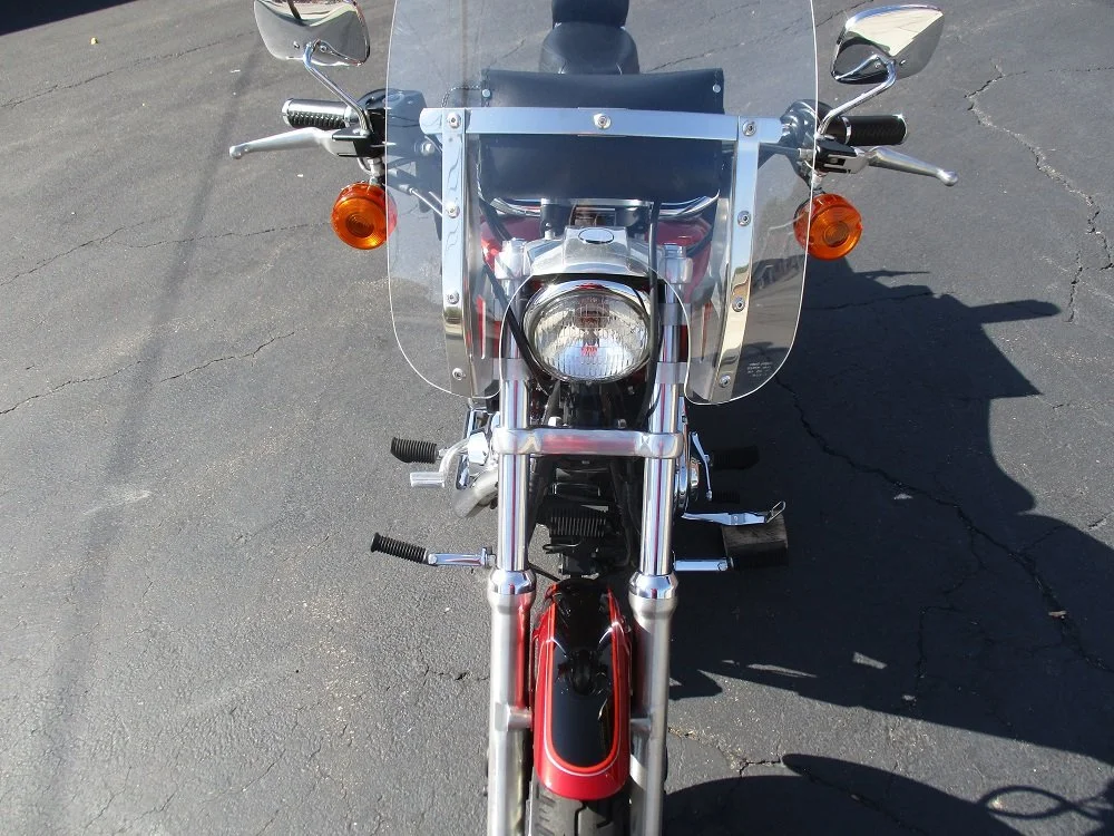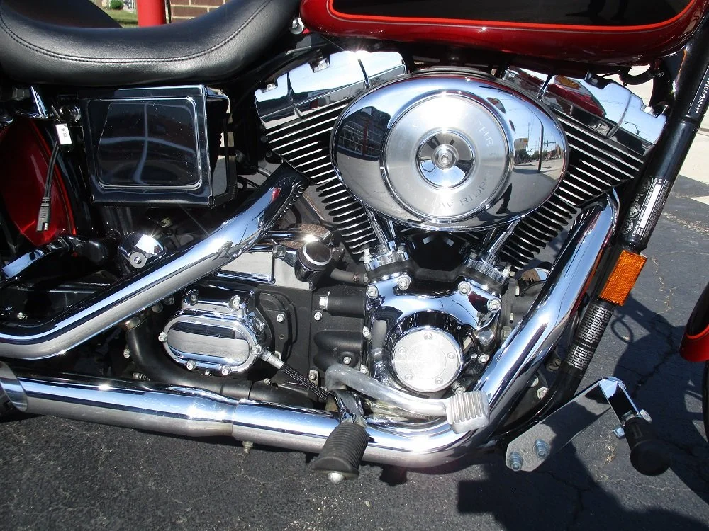 The Harley-Davidson FXS Low Rider was a classic American cruiser motorcycle that debuted in 1977. It was part of H-Dās Dyna family and was known for its distinctive styling and powerful performance. In 1993 Harley introduced the FXDL Dyna Low rider which continued through 2009. In 1999 The displacement was increased to 88ā delivering more power and torque than the previous model. The bike still remained essentially unchanged in the aesthetic department, with a raked-out fork, a round headlight, a teardrop-shaped fuel tank, a one-piece dual seat with a low riding position and a chrome performance exhaust with a deep chopper note. Its suspension was fitted on a tubular steel frame and included a 39 mm telescopic fork on the front and dual side-mounted shock absorbers on the rear, offering excellent suspension performance and handling. The front end is equipped with dual disc brakes and another on the rear delivering excellent stopping power. This particular example was optioned in a gorgeous two-tone Laser Red and Vivid Black that look great together. It has been nicely upgraded with a passenger backrest, a windshield, a large windshield pouch, leather saddle bags and leather grips. Within the last 2,000 miles it received new tires, brakes and a battery. Within the last 200 miles it received new fluids and filters. The bike is very original and in amazing shape for a bike of its age. It currently has 25,345 miles and everything works as it should. Based on the current JD Power values we would appraise this bike for $8,545. We have priced it to sell quickly so donāt wait until itās too late to contact us!